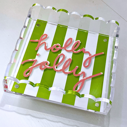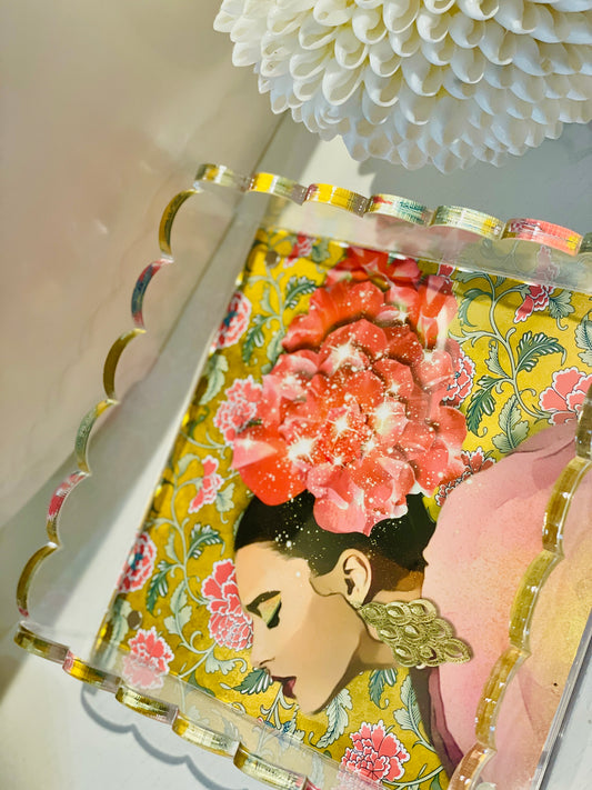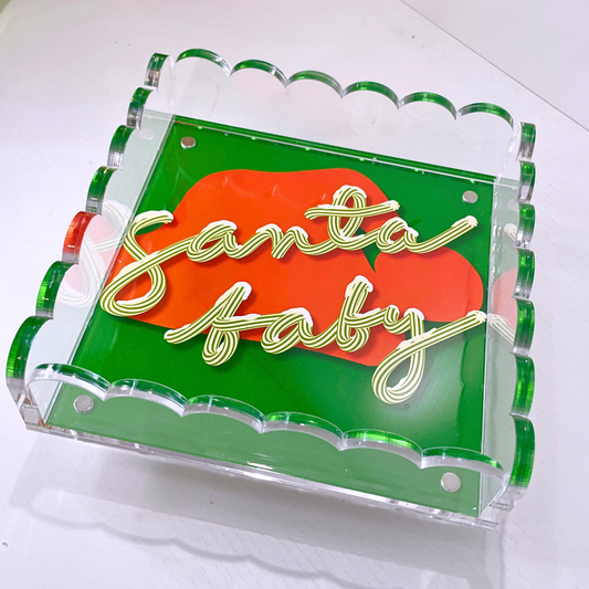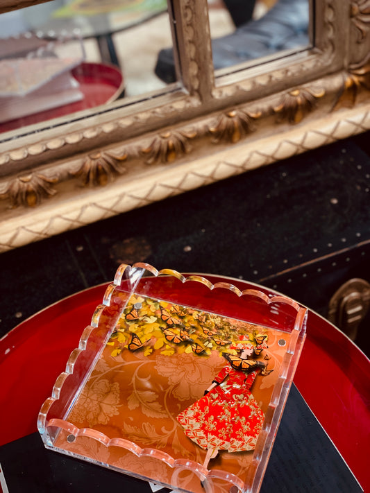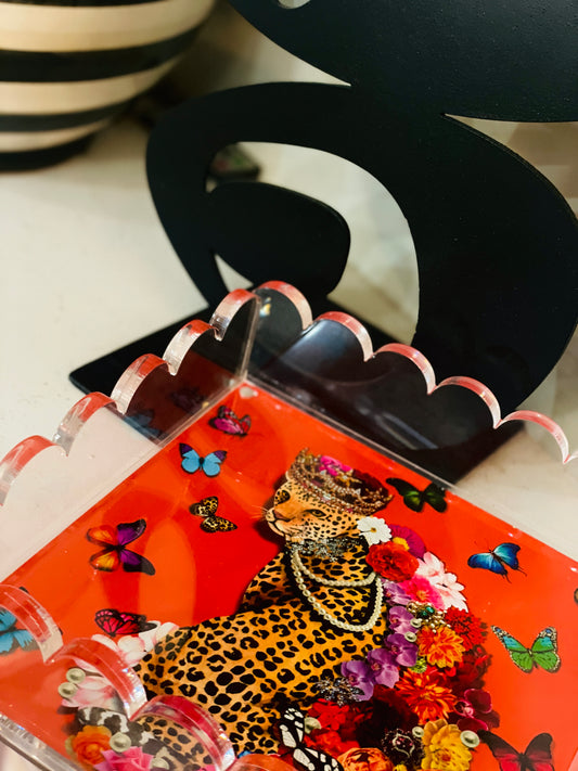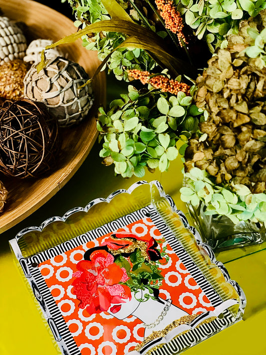 8” x 8” custom art print in heavy duty square lucite tray with adorable scalloped edge. Perfectly sized to pair with your other favorite decor to style your console/coffee tables, nightstands, bookshelves…. anywhere you need a pop of color and chic storage!