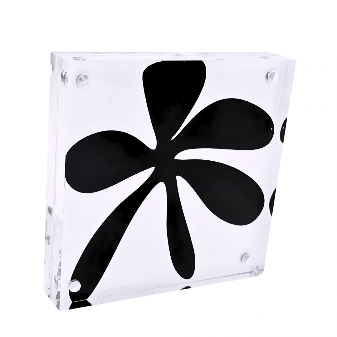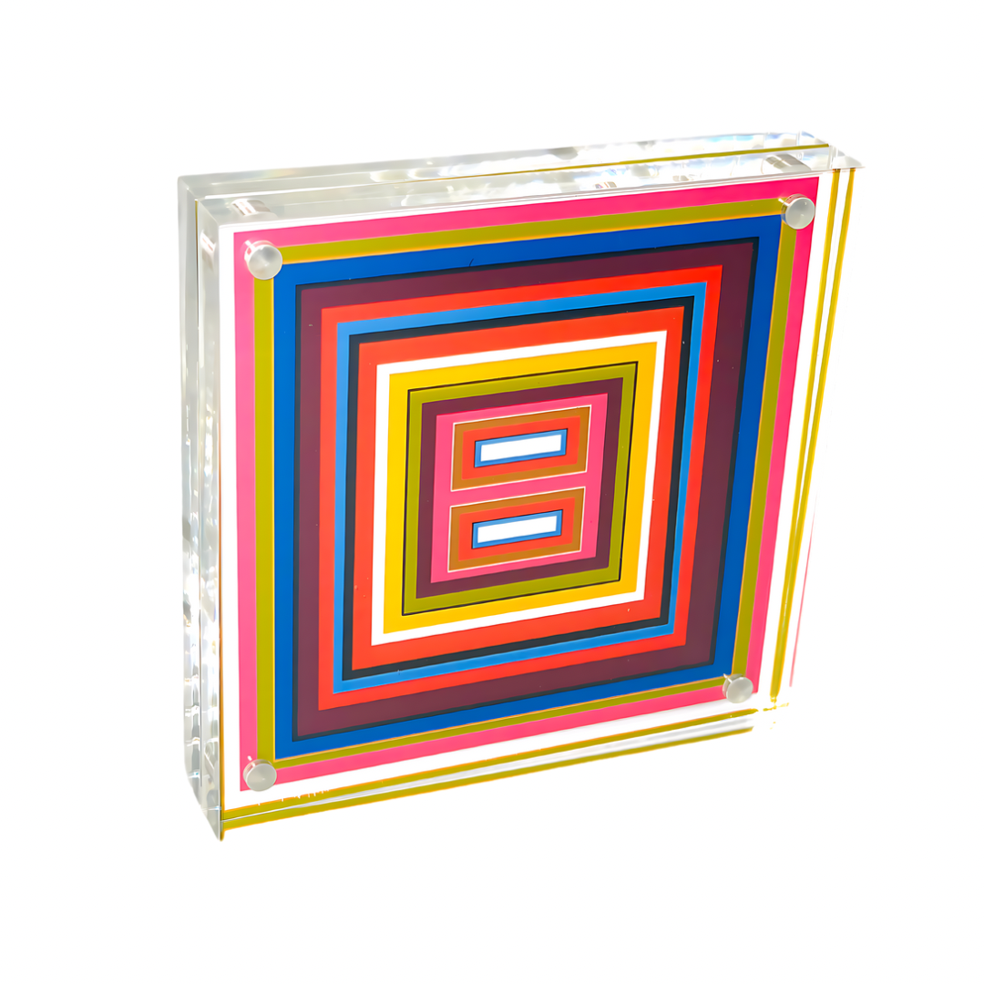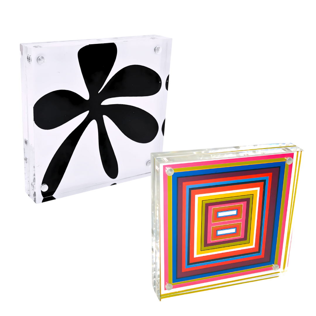 4”x4” double sided art prints in heavy duty square lucite frame. Perfectly sized to pair with larger Shelfie and your other favorite decor to style your bookshelves, console/coffee tables, nightstands, pianos… anywhere you need a pop of color! Delivered in deluxe gift box with corner protectors and cleaning cloth.