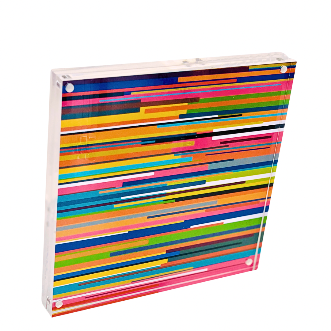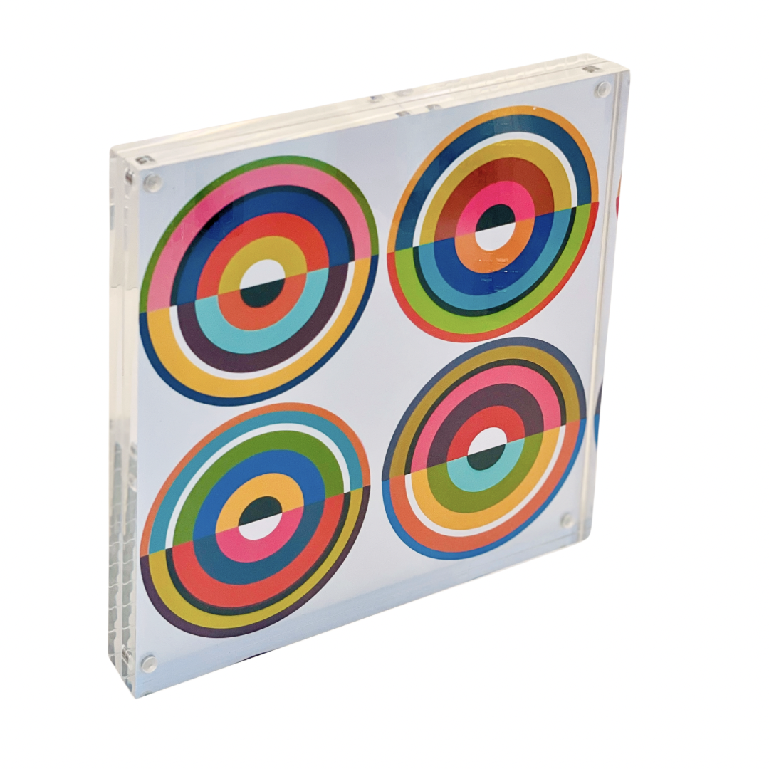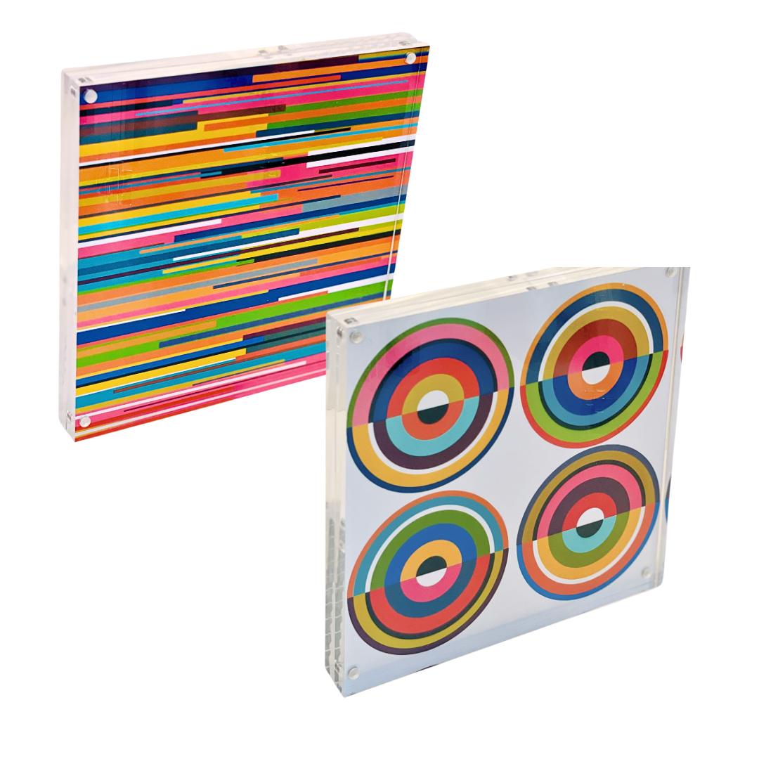 4”x4” double sided art prints in heavy duty square lucite frame. Perfectly sized to pair with larger Shelfie and your other favorite decor to style your bookshelves, console/coffee tables, nightstands, pianos… anywhere you need a pop of color! Delivered in deluxe gift box with corner protectors and cleaning cloth.