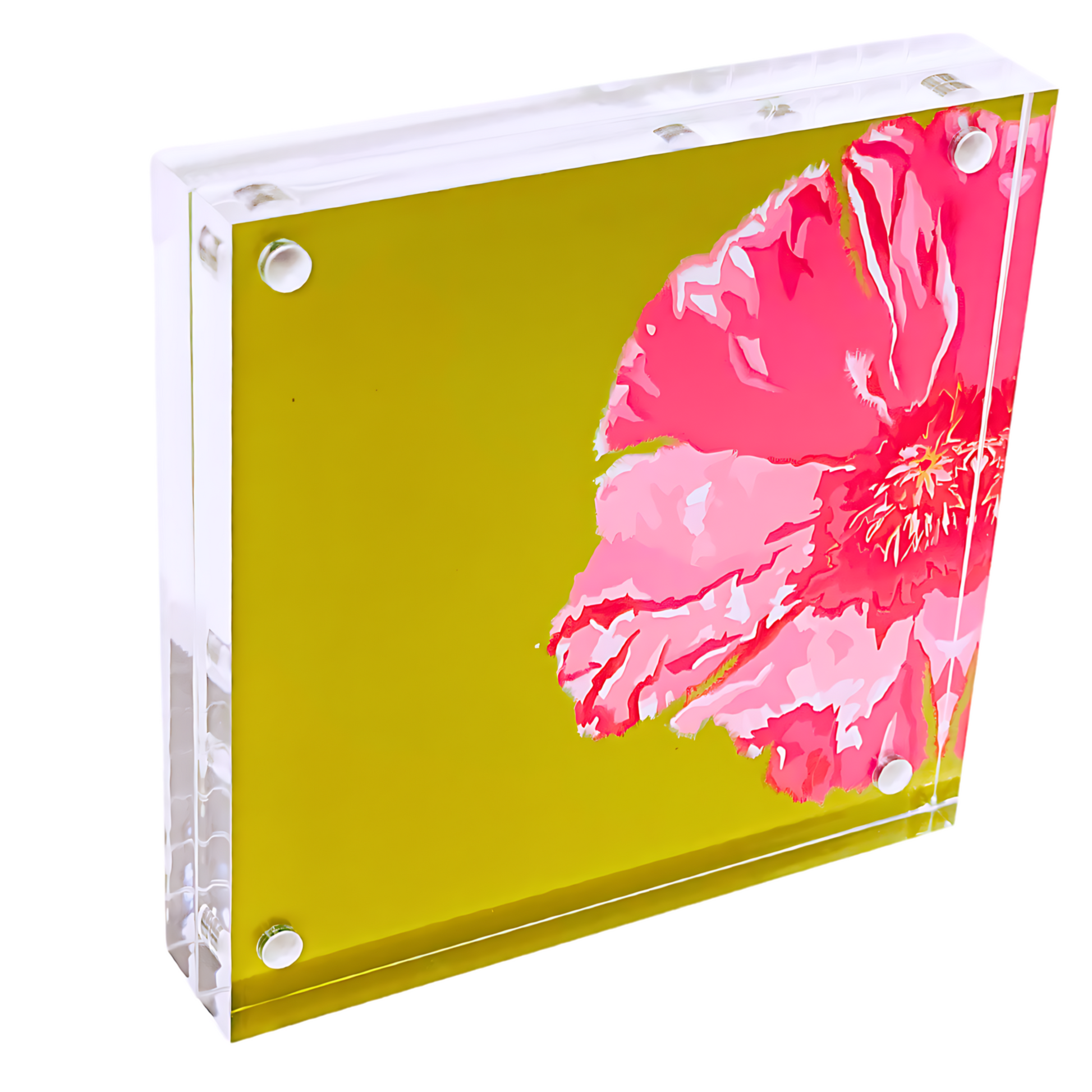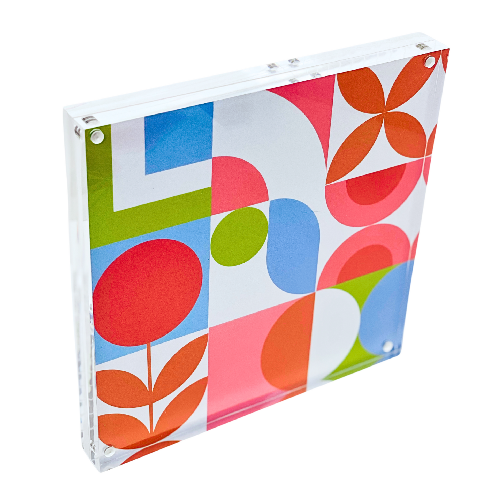 8”x 8” double sided art prints in heavy duty square lucite frame. Perfectly sized to pair with smaller Shelfie and your other favorite decor to style your bookshelves, console/coffee tables, nightstands, pianos… anywhere you need a pop of color! Delivered in deluxe gift box with corner protectors and cleaning cloth.