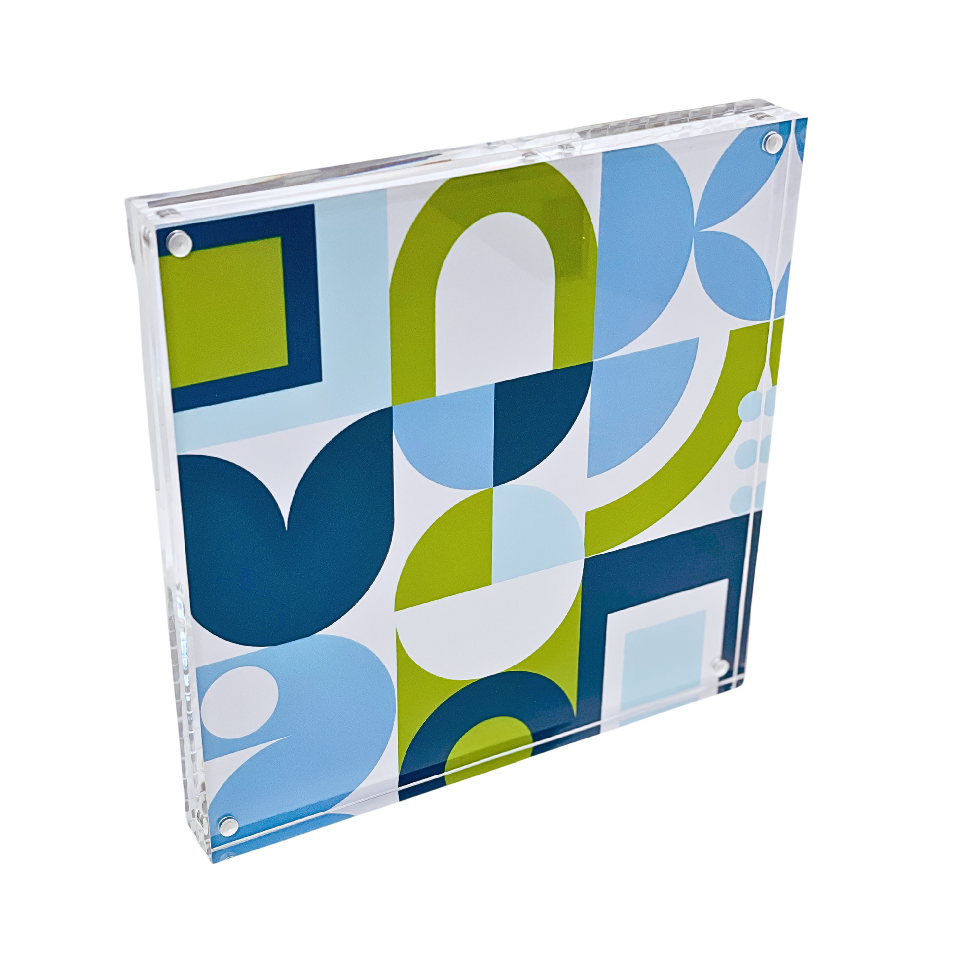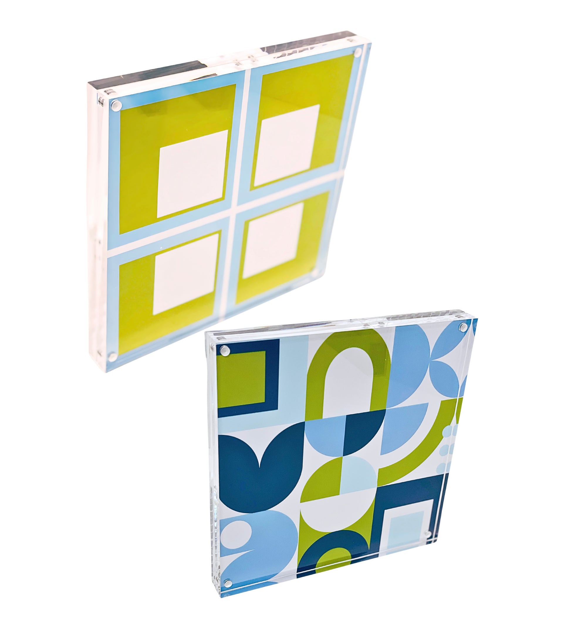 8”x 8” double sided art prints in heavy duty square lucite frame. Perfectly sized to pair with smaller Shelfie and your other favorite decor to style your bookshelves, console/coffee tables, nightstands, pianos… anywhere you need a pop of color! Delivered in deluxe gift box with corner protectors and cleaning cloth.