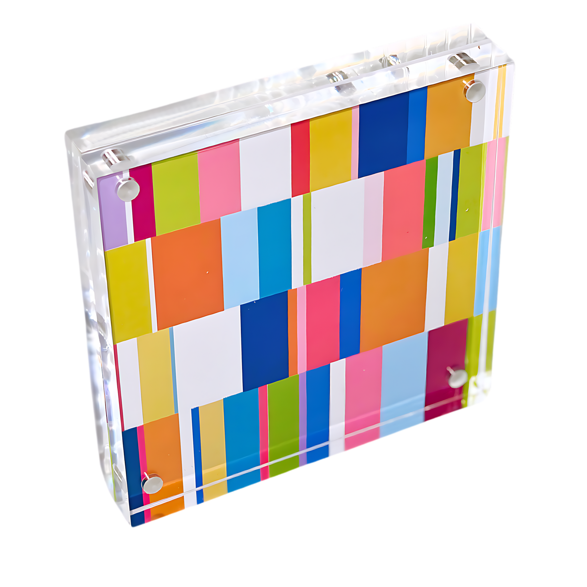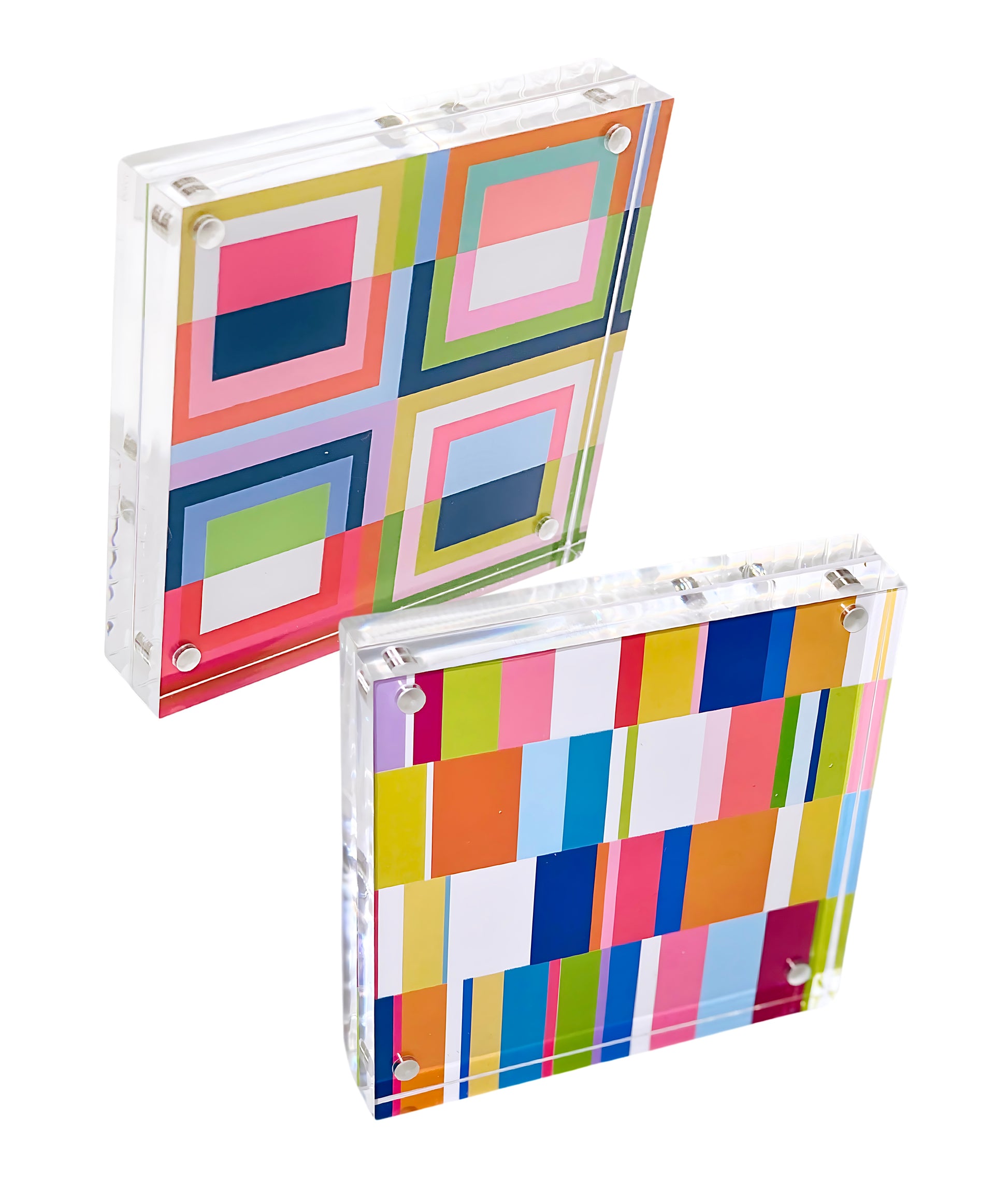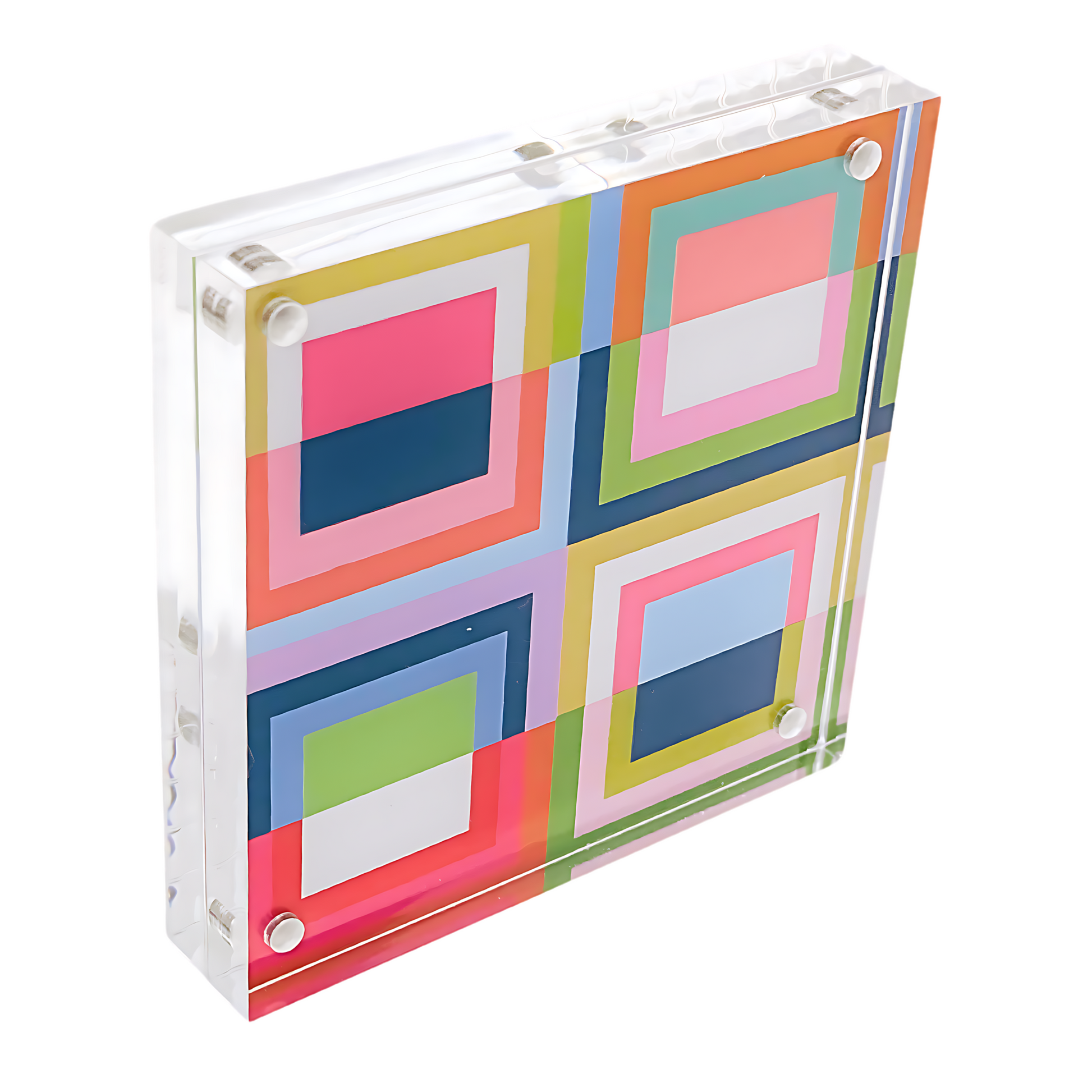 8”x 8” double sided art prints in heavy duty square lucite frame. Perfectly sized to pair with smaller Shelfie and your other favorite decor to style your bookshelves, console/coffee tables, nightstands, pianos… anywhere you need a pop of color! Delivered in deluxe gift box with corner protectors and cleaning cloth.